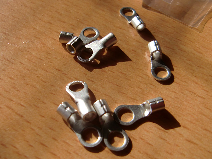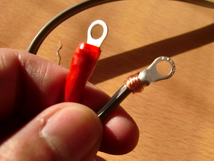 丸型圧着端子は、後ろの穴に銅線を5ミリくらい頭出る様にして、ペンチで潰して、更に出来れば、ハンダを流して密着させると、◎っす!接触悪いと、熱を持ったり、スパークする可能性もあるので、気をつけて下さいね〜!後、念のためにブレーカー付きの延長コードがあれば、オススメします!