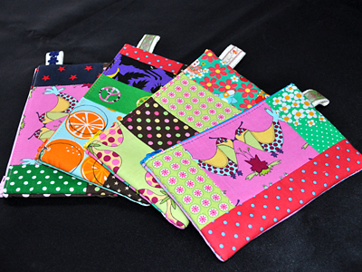 相変わらず「一体こんな生地、どっから見つけてくるんだ?」というような派手なものを使ってのパッチワークポーチです。