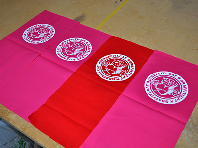 昨日裁断した巾着生地にエンジェルハートを刷りました。