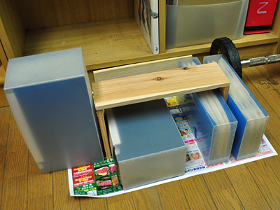 「なんでCDケースとダンベルやねん!」と思うかもしれませんが、これ、なかなか最適でした(真っ直ぐなのと、結構重いから)。