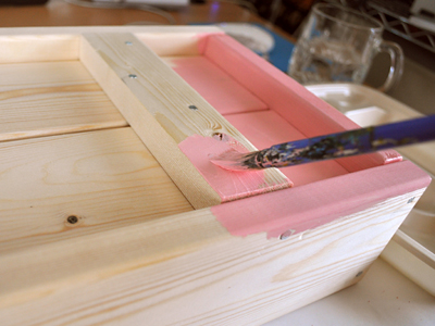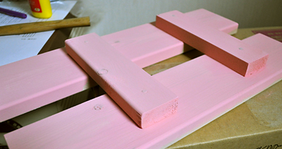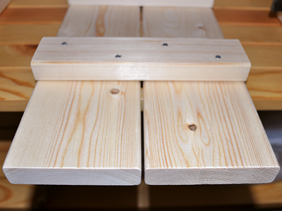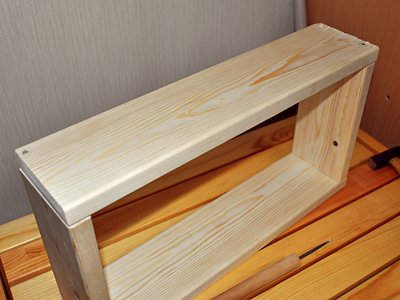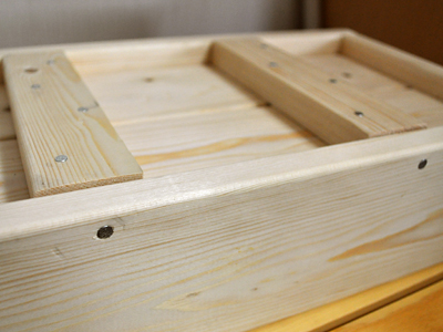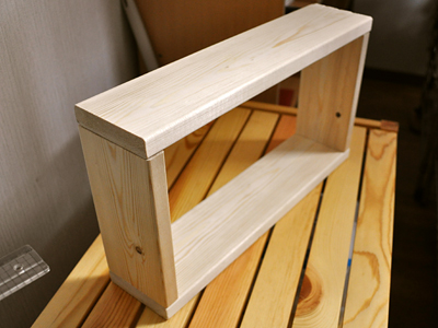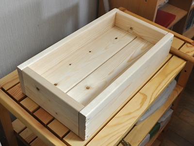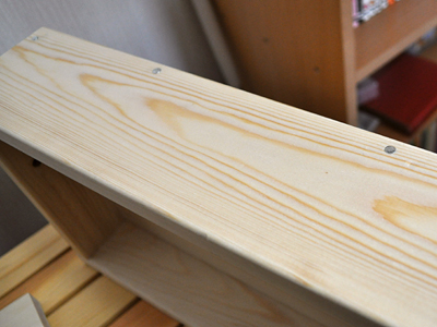 まぁこれは、先ほど作った箱に幅を合わせて木工用ボンドを塗って、釘を打つだけ。