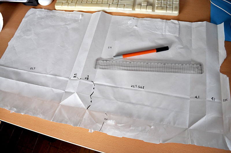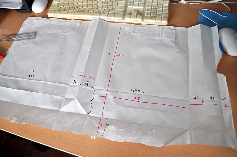 これを元に、以前、袋を作ったときのデータを参考にして、ざっくりと制作サイズを決めていきます。