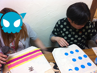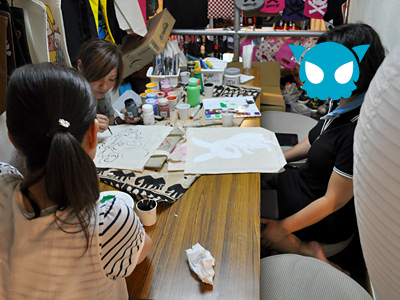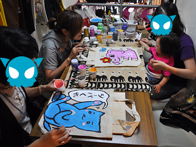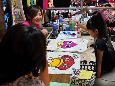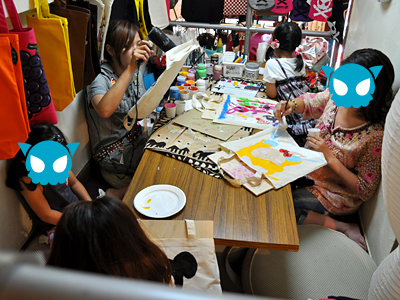 その後、前日行われたイベントであゆさんがチラシを配って、それを見て来てくださった母娘さんや、ブルームーンに雑貨を置いている作家さん達と「手描きエコバッグ」。