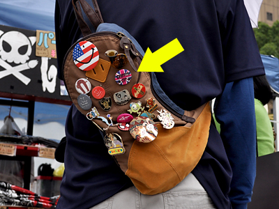 東海エコフェスタんときは、えりなちゃんが手描きバッグ、お父さんが缶バッジを買ってくれましたが、お父さん、缶バッジを早速着用!