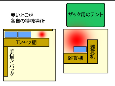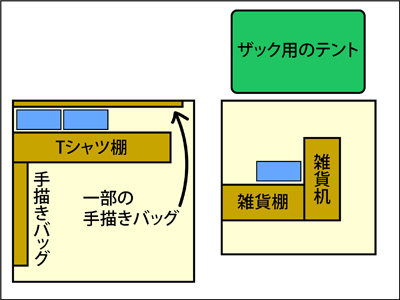 どんな設営にしようかと現地で悩みましたが、手描きバッグを減らして、向かって右ブースは衣類と手描きバッグ、左ブースは雑貨のみという構成。配置図はこんな感じ。