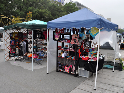 雨の日はテントをくっつけることができないので、少し離して設営。別々のブースっぽく見えるけど、まぁ、しょうがないです。