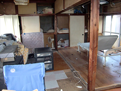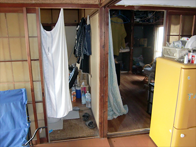 この日も午前中だけの予定でしたので、とりあえずは部屋の仕切りとなってた襖や引き戸を外し、一部ゴミの整理を行いました。