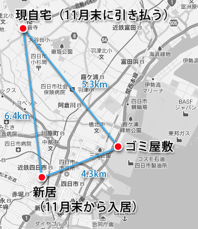 ちなみに現自宅、新居、ゴミ屋敷。この3者の位置関係はこんな感じ。