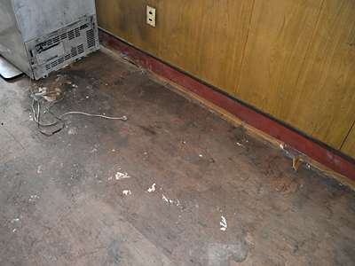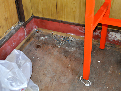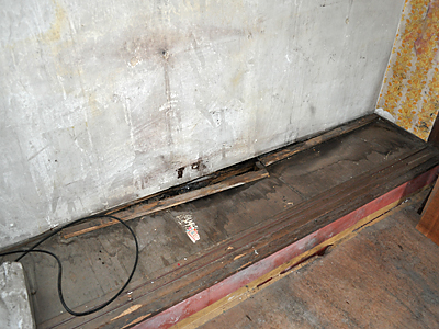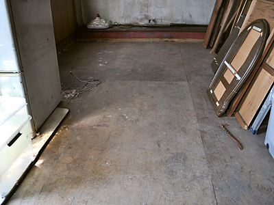 板が腐ってるのは当然として、ネズミとかに囓られて穴が空いてたり、腐ったゴミがくっついてたり、壁と床の隙間はガムテープが貼ってあったりと結構すごい状況ですので、当然交換しなければいけません。