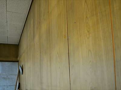 雨漏りで壁の板が腐り、裏のトタンっぽいのが見えてるのがわかります。