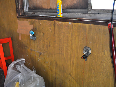 駐車場側の窓の上部には、空調用に無理矢理開けた通気口があり、ちょっとバキバキです。