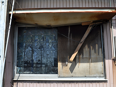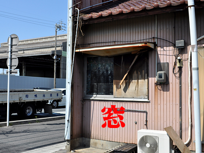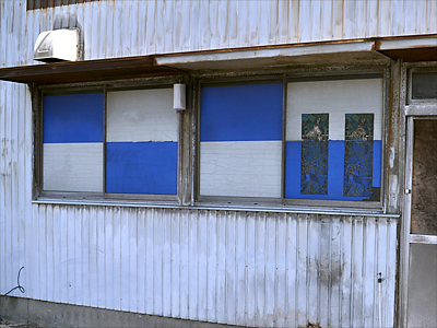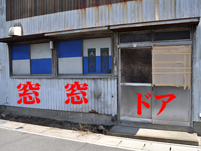 国道側の窓ガラスは、中が見えないすりガラスに、カッティングシートが貼られている状態。カッティングシートは風化してぼろぼろ。