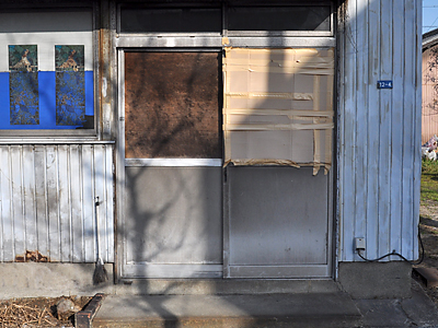 ちなみに、ここの庇(ひさし)が凹んでるのは、以前、鉄くず業者が店舗スペースの空調を取りに来たときに、無理矢理ホースを引っこ抜いたため。