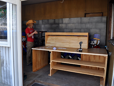 このでっかい机は、先日いもうとがKu’uGardensの本田さんとこからもらってきたやつ。将来は店舗用什器になる予定です。