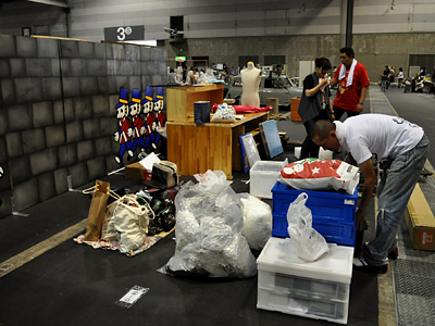 掃除してスッキリした店舗スペースを利用して、朝からブースの仮設営。
