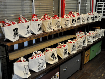 カルは早速、昨日作ってた巾着の取付作業、ヒモ通し等を行い、現在合計27個完成。