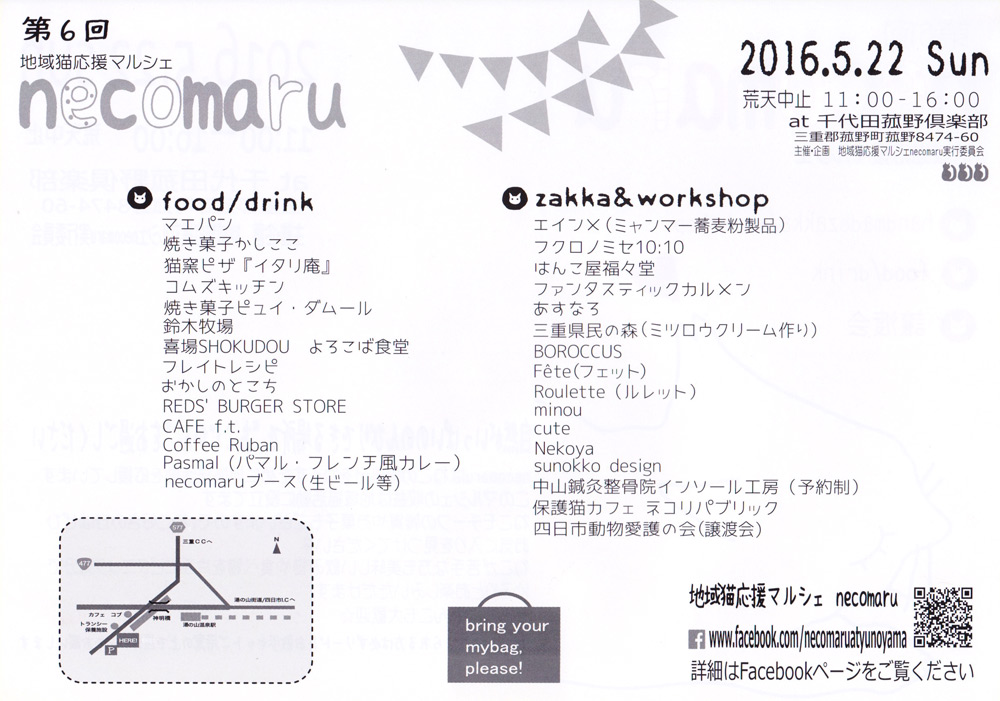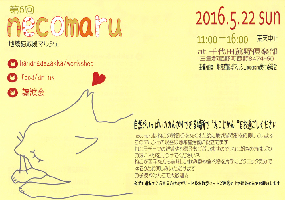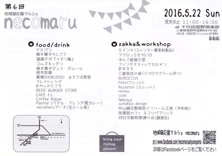2016年5月22日(日)、菰野で開催される「第6回 necomaru-地域猫応援マルシェ」のチラシが完成、うちにも送られてきました。
