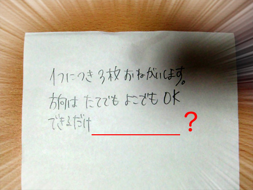 作業時間が少なくなるので、んじゃま「何か手伝えることがあればやるよ」と提案すると、今朝、この生地と指示書がテーブルの上に置かれてました。