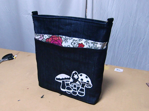 ボディは表裏ともに丈夫なデニムですが、見える箇所は母が好きそうな生地を使いました。
