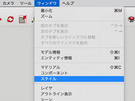 この黒線を細くするには、まずメニューから「ウィンドウ」→「スタイル」を選択。