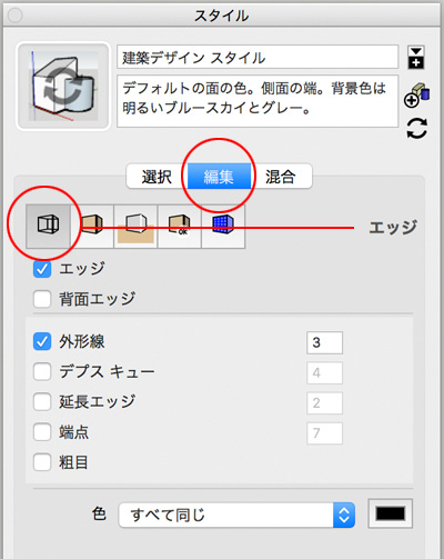 下に連なってる5つの立方体っぽいボタンは、デフォルトで左端の「エッジ」が選ばれてますのでエッジのままで。