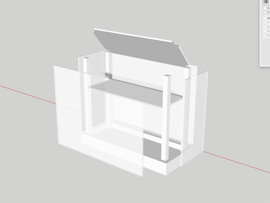 「3D」といえばリアルに近いものを想像しますので、当然この外形線がないほうがカッコイイ場合が多いと思いますが、このSketchUpではシャドウやグラデーションの扱いが非常に手間のようなので(別のソフトを使ったり、きっちりしたサイズのテクスチャを用意するしかないみたい)、外形線がないと何だか変な感じですねぇ。