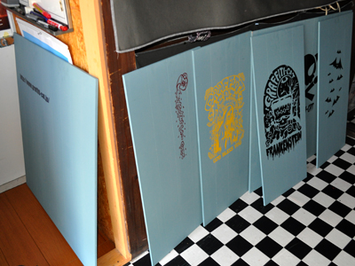 塗装後は什器の壁にプリント。良い感じになってきました。
