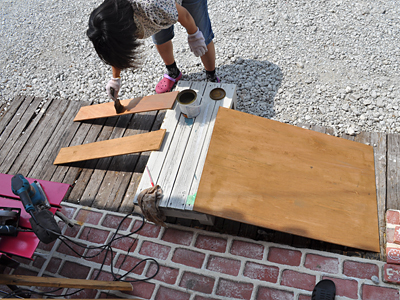 解体した什器を、北側スペースにハマるように丸鋸で切断(カルが)。
