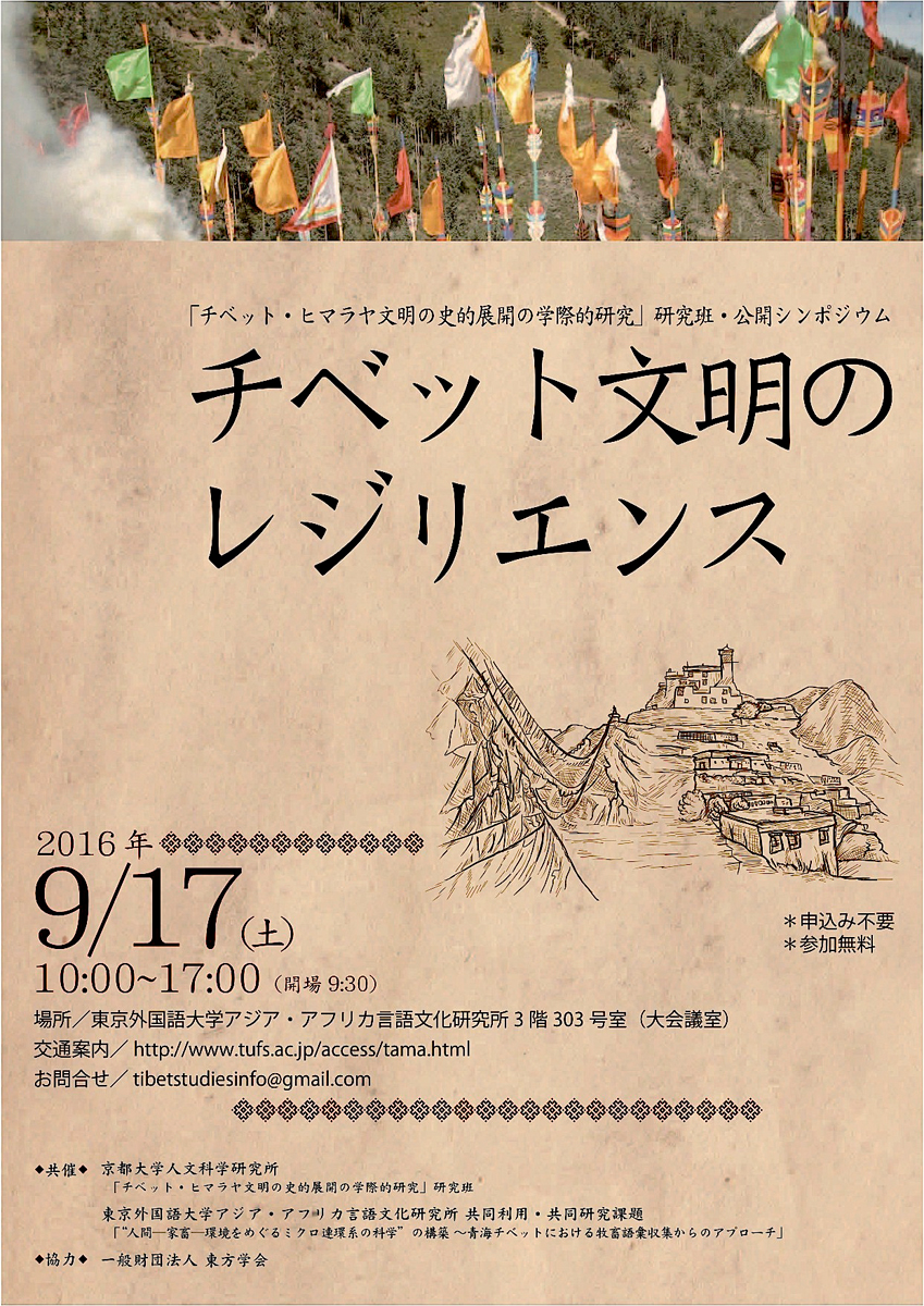 報告は岩尾一史(神戸市外大)・井内真帆(神戸市外大)・小松原ゆり(明治大学)・別所裕介(広島大)・根本裕史(広島大)・小西賢吾(金沢星陵大)、コメンテーターに石濱裕美子(早稲田大)・大川謙作(日本大)・小野田俊蔵(佛教大)・長野泰彦(民博・日本チベット学会会長)が登場予定です。