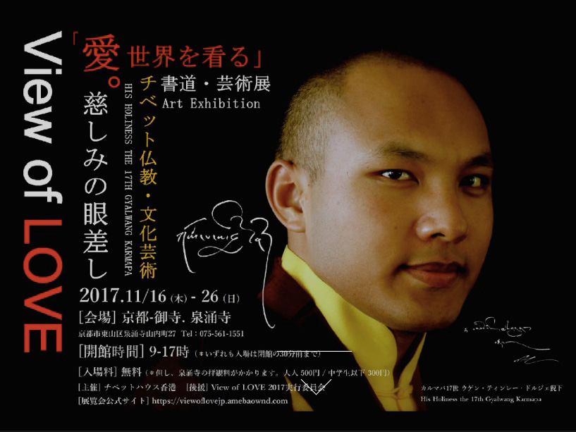 171116〜「View of LOVE」のお知らせ(このポスターめちゃかっこ良い) 2017.11.10 泉涌寺で、チベットハウス香港の主催のカルマパの書道・芸術展が開催されます。 【日時】2017年11月16日(木)〜11月26日(日)9:00〜17:00 【会場】泉涌寺(京都市東山区泉涌寺山内町27) 【料金】無料(ただし泉涌寺の拝観料が要ります/大人500円) 【参照】View of LOVE