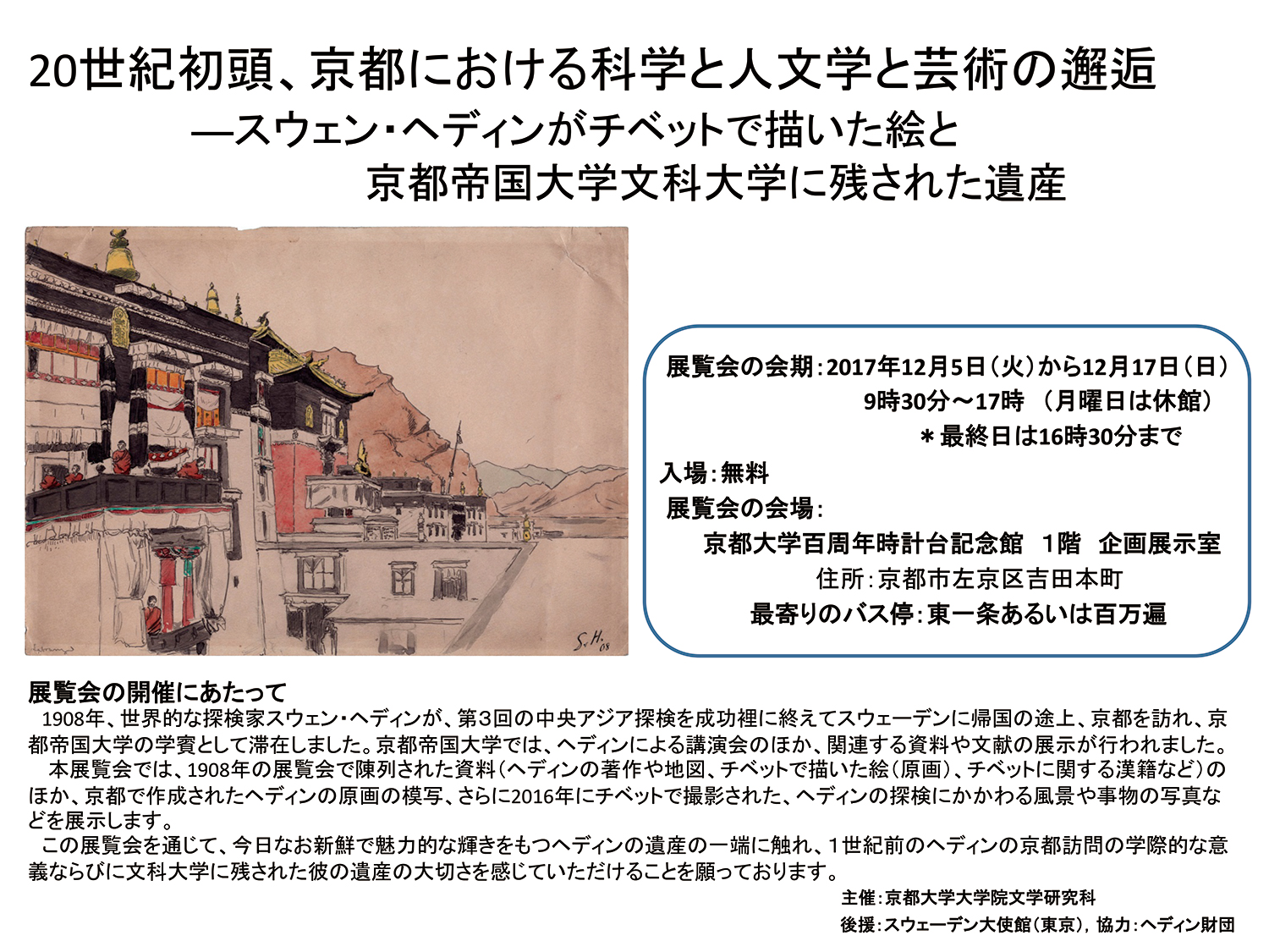 2017年12月5日(火)より2017年12月17日(日)までの2週間、京大の時計台下の展示室にて、スウェン・ヘディンによるチベットのスケッチの展示会を行なわれます。