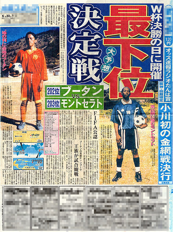 もう一つのファイナルにせまるドキュメンタリー 2002.10.14 知ってる人には今更ながらのニュースで申し訳ないんですが、数ヶ月前にW杯決勝戦日に最下位決定戦が最下位(モンテセラト)vsブービー(ブータン)の試合がティンプーで行われました。 “その日”を迎えるまでの両国の様子に追ったドキュメンタリー映画が、現在日本のROBOT社とオランダ・ケッセルズクレイマー氏により制作中とのこと。なかなかの力作のようです。 ちなみに音楽担当はジグミさん。 (K.マツモトさんより情報をいただきました。ありがとございます。)