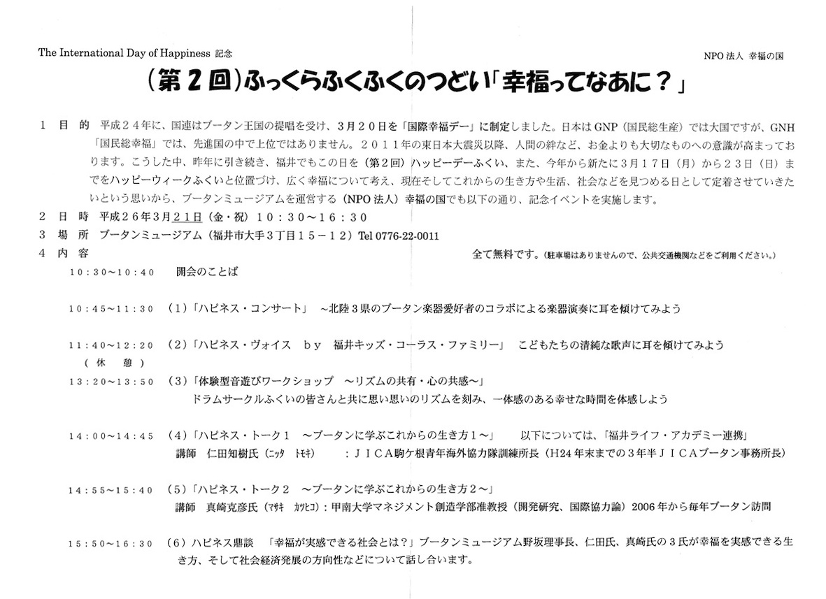 国連が制定している「国際幸福デー」3月20日(ブータン王国の提唱によって決定した)に合わせて、福井にあるブータンミュージアムで幸福をテーマにしたシンポジウムが開催されます。