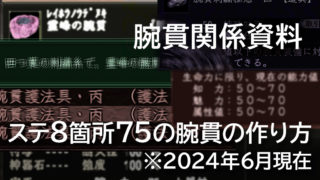 今回は2024年6月時点での「ステータス8箇所75の腕貫の作り方」です。継続的にプレイされてる方には「ハッ、いまさら?」的な感じではございますが、2024年5月頃に復帰した方でも理解出来るように心がけて書いています。以下、記載ミス、清水の勘...