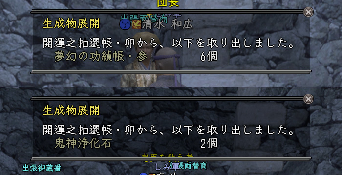 - 上級道場勲札交換(虚空の鬼神石/受継鬼神珠・壱/双継鬼神珠・壱)