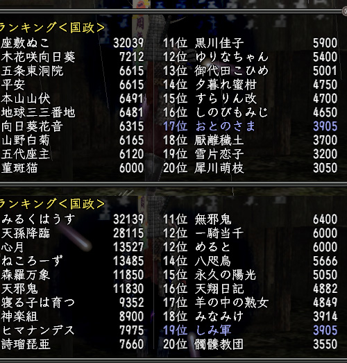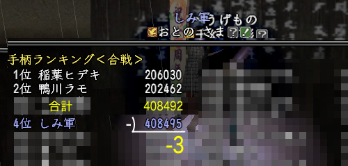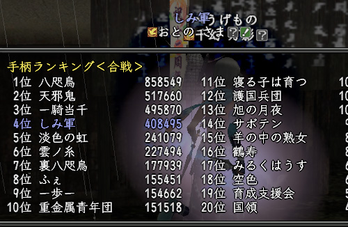 一門別に見ると、うちは住田さん以外合戦に行かないので4位。それでもしみ軍としては上出来です。
