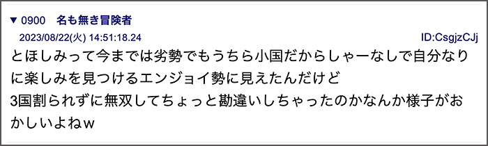 まずは「3国割られずに無双して」って箇所ですが、今季すでに1回か2回割られてます。ついでに「無双」の件ですが、3国合わせても動員人数が最高で150前後くらい(清水が知ってる限り)なので、勝ってる場合でも辛勝レベルです。人数が少ない側がギリギリ勝っても無双とは言い難いと思うので。