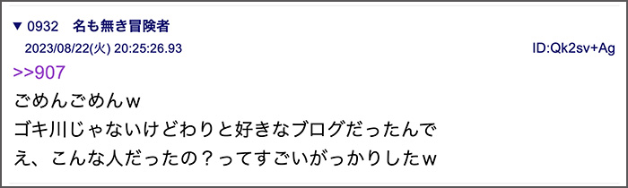 900さんの2回目の投稿の「わりと好きなブログだった」ってところでボクはニマぁとして、「すごくがっかりしたw」でシュンってなったわけですが、恐らくボクの日記をそこそこ読んでくださってる方なのでしょう。いつもありがとうございます。