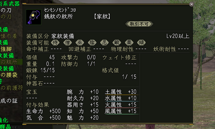 装備面で「基本を抑える」という観点でいえば、やはり紋所と腰袋は外せません。