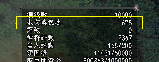 領国銀換算(〝主君直筆感状〟)にすると4万8,000かぁ。まぁ、最終的には領国銀を使うことになるだろうけど、腰袋がまだ価値11でほぼ強化してないことを考えると、出来るだけ節約したいところです。