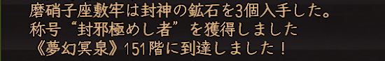 さっきまで「冥泉の称号は120階」だと勘違いしてて、120階に到達しても称号を得られず愕然とし、一気に150階まで進めて称号ゲット。