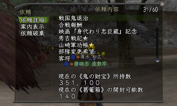 昨日の続きで「戦国鬼退治」。今朝は「英傑・家臣不可」の高難易度戦場にて獲得出来る財宝を確認してみます。