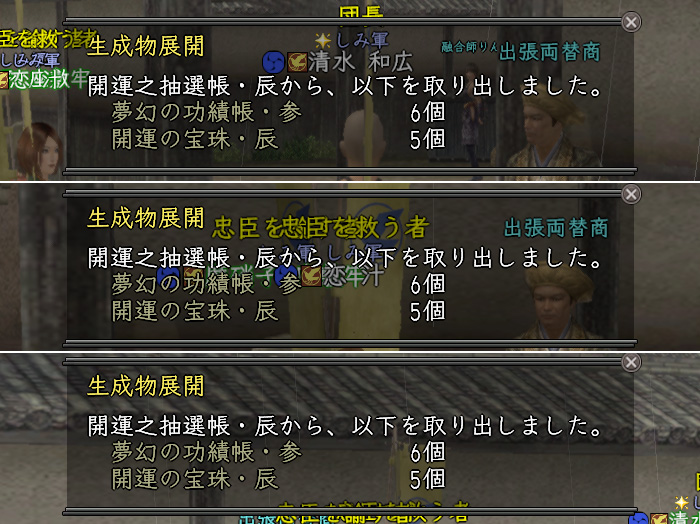 ハロ二チワ。まずは大名物残念でした。そして開運帳はそろっておめでとうございます(笑)イベントもがんばりましたね。しかし付与石でないもんですなー。今週はノルマやって来週にむけてアイテム整理ですのー。がんばりましょう。