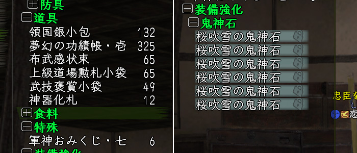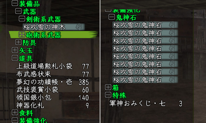 最終的に鉄77個、汁65個、軍73個となりました。確か〝桜吹雪の鬼神石〟は8%の確率でゲットできるハズなので、是非とこ5個以上の入手を期待したいところです。