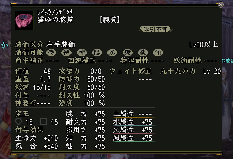九十九がまだなので「完成」とは言えませんが、先日の〝もののふ討伐録〟で〝腕貫護法具箱・丙〟が登場したのでオール75を作るのは楽になりましたねぇ。