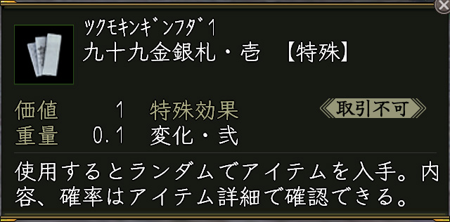 その時登場した新アイテムに〝九十九金銀札・壱〟がありました。