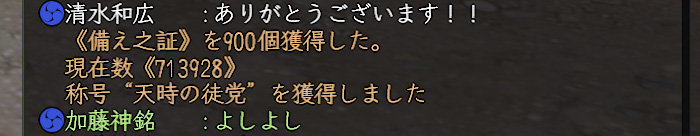 ハロニチワ。7人称号いいですな。私もとりあえず装備製作は終わってるので残ったのをやりたいですな。今日からしみさんも合戦参加なのでがんばりましょう。