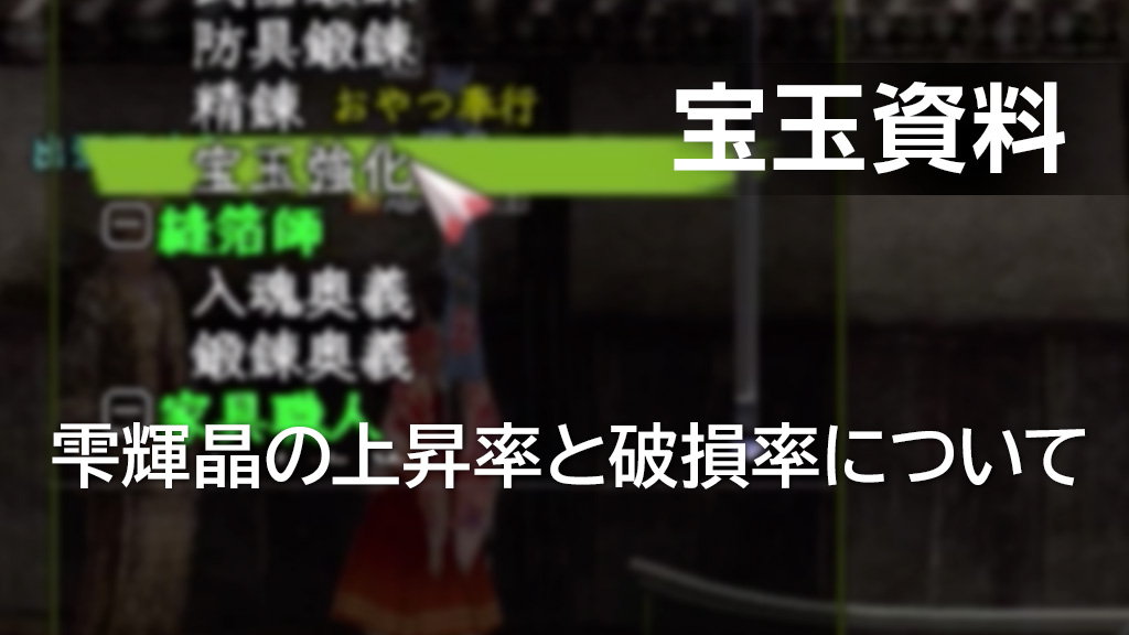 以前調べた〝艷輝晶〟は、上昇率が初期値の約4.4%、破損率が約21.3%だったので、完全に上位素材ということになりそうです。