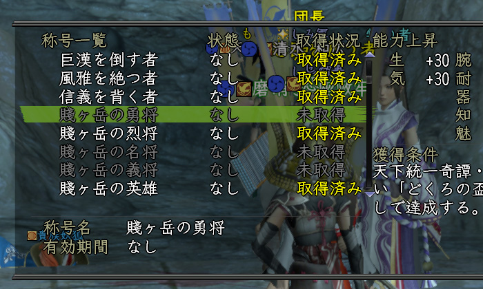 一通り通常コースを終えたあと、〝どくろの杯〟の「英傑なし」「家臣なし」の称号が残ってたので終わらせて、