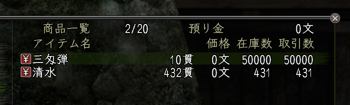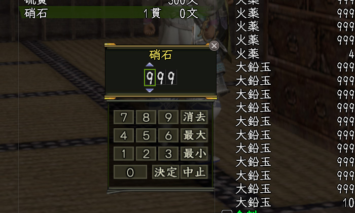 硝石4(4貫)+火薬4(4貫)+大鉛玉10(8貫)で10個出来るわけですから、ざっとした原価で1貫600文。